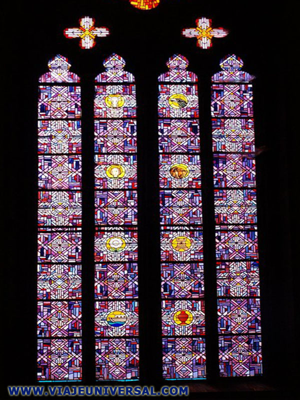 El altar mayor realizado en piedra forma un impresionante conjunto adornado con la luminosidad del color que llega desde los vitrales de la cabecera.