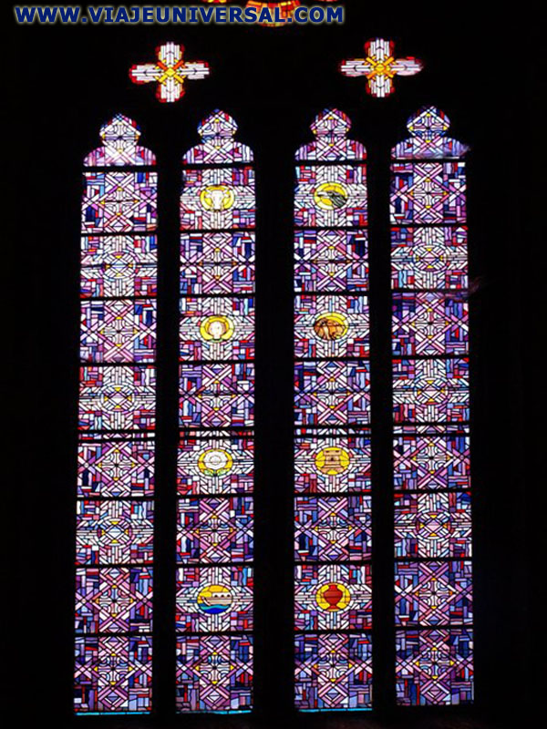 El altar mayor realizado en piedra forma un impresionante conjunto adornado con la luminosidad del color que llega desde los vitrales de la cabecera.