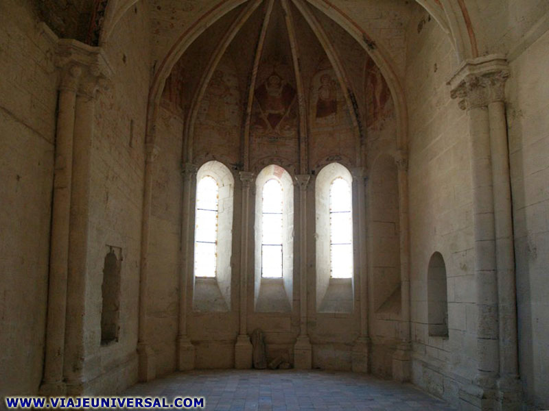 El interior destacan las pinturas que cubren la parte alta del coro del siglo XIV. La Revolución francesa ofreció una curiosa protección al monumento, fue confiscado al clero y vendido a un tonelero quien la transformo en una fabrica de fabricar barricas de madera. Para su manufacturación debía de calentar las tablas de madera, lo que producía humo y este se depositaba en hollín sobre las paredes. Con el paso del tiempo el hollín protegió las pinturas de los rayos ultravioletas y con una sencilla limpieza, en 1997 devolvió los originales a su estado primitivo. En ellas se representa a Cristo rodeado de la representación simbólica de los cuatro evangelistas formada por: el toro de Lucas, el león de Marcos, el águila de Juan y el ángel de Mateo. A la derecha de Cristo esta la imagen de la Virgen con el niño y a la derecha se representa la crucifixión de Cristo acompañado de María y San Juan. A la izquierda San Juan Bautista llevando el Cordero, a la izquierda se representa una escena de la bendición. |