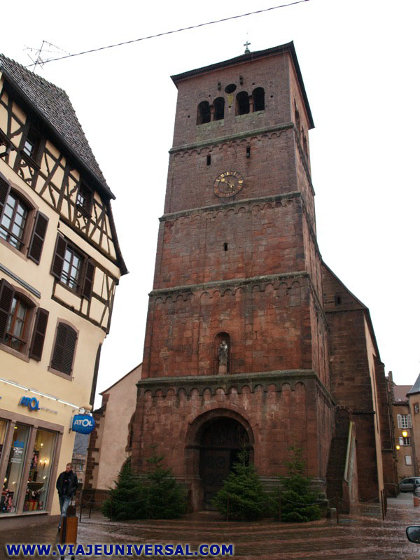 La iglesia de Notre-Dame de la Nativité tiene una arquitectura de estilo románico, en la fachada principal esta la torre construida con cinco cuerpos, en el primero esta la portada principal, en el segundo es ciego y esta decorado con la figura de la virgen, el tercero es ciego solamente iluminado por una minúscula ventana románica, el cuarto, también es casi ciego con dos pequeños ventanales de ventilación y además del reloj que cuelga de la fachada, el quinto esta abierto con dos ventanas gemelares de arcos de media punta románicos, es el lugar donde se situaron las campanas; en la derecha del portal principal sobre las mensuras se encuentra la siguiente inscripción DIS IST DI HOLTZ DAN y debajo esculpida sobre la piedra una unidad de medida que hace referencia a la madera, todo el mundo que compraba madera se guiaba por esta medida que era equivalente al metro; destaca la fachada su color rojizo de piedra de arenisca, ahora oscurecida por la humedad de la lluvia.