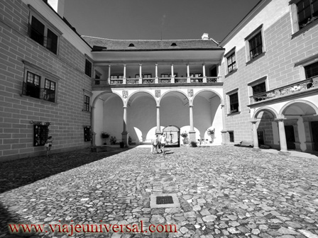 Patio del Castillo de Hluboka |  Su historia se remonta al siglo XIII, cuando se erigió como una fortaleza gótica para proteger la región. A lo largo de los siglos pasó por manos reales y nobiliarias, siendo reformado en estilo renacentista en el siglo XVI y luego en estilo barroco en el XVII. Sin embargo, la transformación más importante llegó en el siglo XIX bajo la familia Schwarzenberg, que decidió remodelarlo por completo entre 1840 y 1871 siguiendo la moda neogótica inglesa.  El resultado es un imponente conjunto de fachadas blancas con torres almenadas, ventanales ojivales y una profusión de detalles decorativos, rodeado por jardines paisajísticos y un extenso parque. El interior conserva una suntuosa decoración historicista: salas revestidas de madera tallada, tapices flamencos, vidrieras, chimeneas monumentales y una rica colección de arte, armas y mobiliario de distintas épocas. Entre las estancias más notables destacan el salón de caza, el comedor noble, la biblioteca y los aposentos privados de los Schwarzenberg.  El tour por las habitaciones reales del castillo de Hluboká es una de las experiencias más destacadas para los visitantes, ya que permite adentrarse en la vida cotidiana y ceremonial de la aristocracia centroeuropea del siglo XIX. El recorrido sigue principalmente los espacios más suntuosos reformados por la familia Schwarzenberg durante la gran remodelación neogótica, mostrando no solo la arquitectura, sino también el mobiliario, la decoración y objetos originales.
