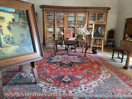 Biblioteca del Castillo de Hluboka |  El recorrido incluye también la sala de billar, un espacio social masculino, y la galería de retratos, con pinturas que narran la historia de la familia Schwarzenberg y sus alianzas. En muchos espacios, el suelo está cubierto con alfombras orientales originales, y las paredes muestran una cuidada combinación de paneles de madera y telas de damasco.