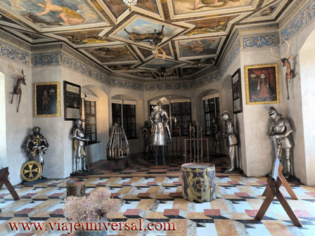Sala de Caza Palacio de Telc |  El visitante también pasa por la sala de los caballeros, adornada con armas y trofeos de caza, que evocan la vida aristocrática en el campo; por los aposentos privados, más íntimos pero igualmente refinados; y por galerías donde se exhiben retratos de la familia Hradec y sus descendientes, que permiten poner rostro a los mecenas que transformaron el castillo.  El recorrido termina en estancias que muestran cómo evolucionó el palacio en los siglos posteriores, incorporando elementos barrocos y rococó, pero siempre respetando el núcleo renacentista que le da su carácter único. Al salir nuevamente a los patios y jardines, el contraste entre el interior rico y solemne y el entorno natural de estanques y colinas hace aún más memorable la experiencia.  Destacamos la visita a Capilla manierista de Todos los Santos La capilla de Todos los Santos en el castillo de Telc es uno de los espacios más singulares del conjunto, un ejemplo exquisito de arte manierista en Bohemia del Sur. Fue concebida en el siglo XVI durante la gran transformación renacentista del palacio bajo Zachariáš de Hradec, cuando maestros italianos aportaron un estilo refinado y cargado de simbolismo.