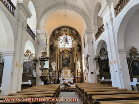 Frescos de la Iglesia de Jesús de Telc |  Al llegar al presbiterio, la mirada queda atrapada por el altar principal. Columnas salomónicas sostienen un entablamento adornado con dorados y relieves. En el centro, la figura de Cristo resplandece, rodeada de ángeles y símbolos que celebran el Nombre de Jesús, al que está dedicada toda la iglesia. Aquí se concentra el mensaje del templo: la fuerza de la fe como luz que guía a la comunidad.  Si cierras los ojos, casi puedes imaginar cómo resonaban los sermones de los jesuitas y cómo llenaban el espacio los cantos litúrgicos y los órganos. La acústica de la nave está pensada para la palabra y para la música, dos de las armas más poderosas que la orden utilizaba en su misión educativa y evangelizadora.