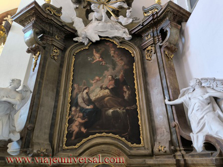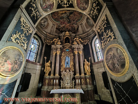 Retablo de la Iglesia de Jesús de Telc |  La fachada del templo se alza sobria, marcada por pilastras que suben verticales hasta el frontón triangular. No es una fachada recargada, pero transmite firmeza y elegancia: la misión de los jesuitas no era impresionar con el exceso, sino con la proporción y la claridad.  Al cruzar la puerta, entras en una nave amplia y luminosa. La luz natural desciende por los altos ventanales y se refleja en los muros blancos, creando un ambiente de recogimiento. El espacio está diseñado para que toda la atención se dirija hacia el altar mayor: nada distrae demasiado, pero los frescos de la bóveda, con escenas de la vida de Cristo y símbolos del Nombre de Jesús (IHS), elevan la vista hacia arriba, recordando la unión entre tierra y cielo.  A ambos lados de la nave encuentras capillas y altares menores. Cada uno está dedicado a santos que refuerzan la espiritualidad jesuita: San Ignacio de Loyola, fundador de la orden, y San Francisco Javier, su gran misionero, aparecen con gestos solemnes. El dorado de los retablos contrasta con el blanco de los muros, subrayando la importancia de la devoción personal.