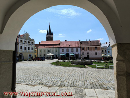 Plaza Mayor de Telc |  Al salir de nuevo hacia el exterior, notas cómo el templo se integra con el colegio jesuita, recordándote que este espacio nunca fue solo un lugar de culto, sino también un centro de enseñanza, cultura y poder espiritual en la Telc barroca.  Una de las atracciones es su Plaza Mayor GPS N49.1842397 E15.4512439, es una verdadera joya, está rodeada de edificios de dos pisos con tejados agallotinados, en la planta baja hay galerías abiertas para la celebración del mercado, en el centro se levanta la columna de la Peste.  Es sin duda una de las plazas más bellas de Europa Central. La espaciosa plaza está rodeada de casas de la época renacentista y al noroeste la cierra el palacio estatal. En las galerías se pueden encontrar tiendas y locales de restauración.  La Námestí Zachariáše z Hradce, la plaza principal de Telc, es el corazón histórico de la ciudad y una de las plazas renacentistas mejor conservadas de Europa. Lleva el nombre de Zachariáš de Hradec, el noble que en el siglo XVI transformó la ciudad medieval en una auténtica joya renacentista.
