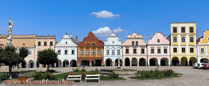 Plaza Mayor  de Telc |  Al entrar en la plaza, lo primero que impresiona es su forma alargada, rodeada por hileras de casas con fachadas continuas, cada una distinta pero armónicamente alineada. Estas casas burguesas, construidas tras un gran incendio en 1530, fueron remodeladas siguiendo el gusto italiano y presentan un repertorio de estilos que va desde el gótico tardío hasta el renacimiento y el barroco. Los pórticos, arcadas y frontones escalonados o curvos crean un ritmo arquitectónico que convierte la plaza en una galería al aire libre.  El centro de la plaza está ocupado por elementos históricos como la columna de la peste (erigida en el siglo XVIII como agradecimiento por el fin de una epidemia), una fuente barroca y antiguos pozos de piedra. Estos detalles recuerdan que la plaza no era solo un espacio representativo, sino también el lugar de mercado y de encuentro cotidiano.  Cada casa tiene su historia: algunas conservan esgrafiados renacentistas, otras fachadas barrocas pintadas en colores pastel, y todas juntas forman un conjunto único, inscrito por la UNESCO como Patrimonio de la Humanidad en 1992.  En un extremo de la plaza se alza el castillo de Telc, conectado con la zona fortificada y con los estanques que rodean la ciudad. En el otro extremo, se abren las calles que llevan hacia las iglesias y los antiguos barrios artesanos.