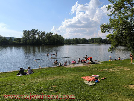Lago de  Telc |  Aprovechamos para comer en la misma plaza tienen como especialidad el pollo marinado y rebozado con pan y patatas fritas, son 48 euros los cuatro con bebida.  Nos informan donde pasar la tarde a orillas del lago con posibilidad de bañarnos, con sombra y césped y todo free.  Hay que tener en cuenta que el país no tienen playas de mar pero si muchas de agua dulce, todos los pueblos tienen su lago donde la gente acude para disfrutar de los deportes acuáticos.  Pues no dirigimos al lago para darnos un baño y bajar las temperaturas. La entrada desde la carretera es un tanto estrecha, pero no tiene ningún problema para aparcar, si vas a pasar la noche tienes que darte de alta en el camping, es barato. El restaurante se llama U Roštenky GPS N49.1938121 E15.4478851.  Es famoso por las truchas al grill, aprovechamos a última hora de la tarde para cenar, encargamos dos truchas grandes para los cuatro y al final nos sirven dos más bien pequeñas, la consecuencia es que nos quedamos con hambre, pagamos 520 coronas unos 20 euros.