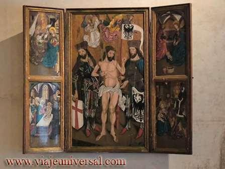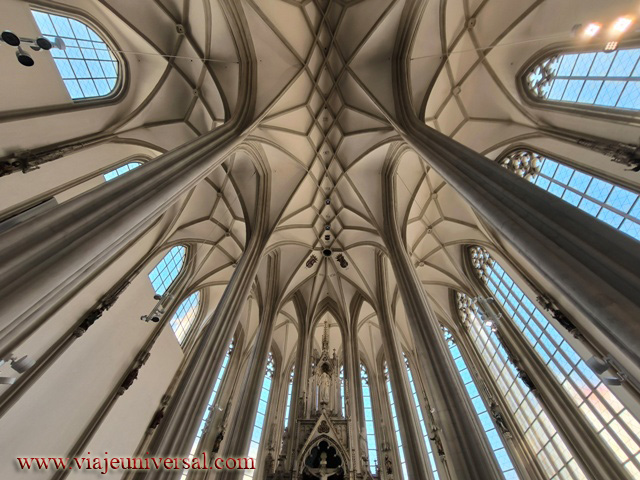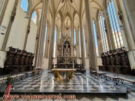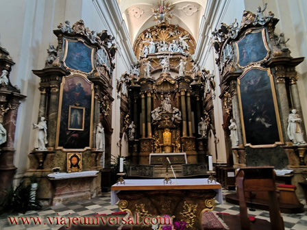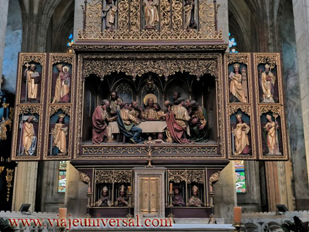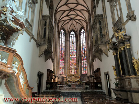 Retablo Mayor de la Iglesia de san Vito de Cesky Krumlov |  El retablo mayor de la iglesia de San Vito en Ceský Krumlov es una pieza neogótica realizada en el siglo XIX, que reemplazó al altar original de época gótica destruido o desmontado durante reformas anteriores. Su diseño sigue fielmente el estilo medieval, con una estructura vertical muy marcada, pináculos, tracerías y elementos ornamentales que evocan la arquitectura de catedrales góticas.  En la parte central del retablo se encuentra una gran imagen de San Vito, patrón de la iglesia, representado como un joven mártir con palma y caldero, símbolo de su martirio. A ambos lados se sitúan esculturas y relieves de santos de especial devoción en Bohemia, entre ellos san Wenceslao y santa Ludmila, así como figuras vinculadas a la tradición católica centroeuropea. La policromía y el dorado acentúan los detalles, aportando un carácter solemne y luminoso al conjunto.  En la predela, o parte inferior, se hallan escenas de la vida de Cristo y de San Vito, pintadas o talladas en relieve, que sirven como catequesis visual para los fieles. La parte superior culmina en un gran pináculo central con una cruz y detalles florales, elevando la mirada hacia el cielo.