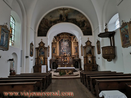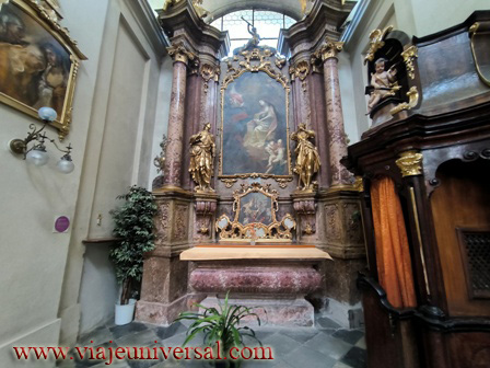 Talla policromada de San Wolfgang Monasterio de los Franciscanos de Cesky Krumlov |  El altar gótico original estaba presidido por una talla policromada de San Wolfgang con mitra y báculo episcopal, bendiciendo con la mano derecha. Aunque la pieza original se perdió en épocas posteriores, en su lugar se instaló en el siglo XVII un retablo barroco con una pintura al óleo del santo, rodeada por columnas salomónicas y coronada por ángeles dorados.  En el pavimento aún se aprecian fragmentos de lápidas sepulcrales de benefactores vinculados al monasterio, y en el muro sur se conserva una ventana geminada cegada, vestigio de una ampliación que nunca se realizó.