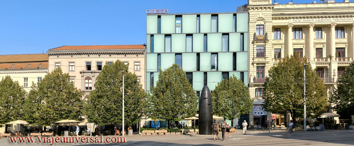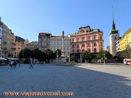 Plaza de la Libertad de Brno |  La plaza está rodeada por un conjunto diverso de edificios históricos y modernos que reflejan la evolución arquitectónica de Brno. Entre los más destacados se encuentra la Casa de los Señores de Lipá, con relieves renacentistas de escenas bíblicas y mitológicas; el Palacio Klein, con su imponente fachada neorrenacentista adornada con hierro colado; y la Casa de los Cuatro Zoquetes, célebre por las esculturas de atlantes que sostienen su entrada. Junto a estas construcciones tradicionales conviven ejemplos más recientes como la sede funcionalista del banco Komercní banka o el moderno palacio Omega, con su llamativa iluminación nocturna.  En el centro del espacio se concentran tres símbolos muy particulares. La columna de la peste, erigida en 1679, recuerda los tiempos de epidemias y agradece la protección divina sobre la ciudad. Junto a ella se encuentra una fuente de bronce que incorpora versos del poeta Jan Skácel, y un elemento contemporáneo que no pasa desapercibido: el reloj astronómico de Brno, inaugurado en 2010. De granito negro y con forma de obelisco irregular, libera cada día a las once de la mañana una pequeña bola de cristal que los visitantes intentan atrapar como recuerdo. Otro detalle casi invisible pero significativo es la línea trazada en el pavimento que marca el lugar donde estuvo la antigua iglesia de San Nicolás, demolida en el siglo XIX para ampliar la plaza.