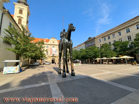 Iglesia de Santiago de Brno |  En la puerta de la iglesia se levanta La Escultura Ecuestre del Margrave Jobst de Luxemburgo GPS N49.1976965 E16.6071991 , conocida como Socha Odvaha (Escultura de la Valentía), es una de las obras más destacadas del arte contemporáneo en Brno, República Checa. Inaugurada en 2015 en la Plaza Moravské námestí, esta escultura rinde homenaje a Jobst de Moravia, miembro de la Casa de Luxemburgo, quien fue Margrave de Moravia desde 1375, Duque de Luxemburgo y Elector de Brandeburgo desde 1388, y fue elegido Rey de los Romanos en 1410 hasta su muerte en 1411.  La escultura fue diseñada por el artista checo Jaroslav Róna y se erige sin pedestal, alcanzando una altura de 8 metros. Está elaborada en bronce y representa a un caballero medieval montado en un caballo con patas inusualmente largas, lo que le otorga una presencia imponente y permite que la escultura se eleve sin la necesidad de un pedestal tradicional  El concepto detrás de la escultura es una alegoría de la valentía, una de las virtudes cardinales según Platón. Sin embargo, la elección de esta virtud ha sido objeto de debate, ya que algunos historiadores argumentan que la diplomacia fue la característica más destacada de Jobst  La escultura se encuentra en el centro de la Plaza Moravské námestí, frente a la Iglesia de San Tomás, y es un punto de encuentro popular tanto para locales como para turistas. Los visitantes a menudo se colocan entre las patas delanteras del caballo para admirar la escultura desde abajo, lo que proporciona una perspectiva única y permite apreciar la magnitud de la obra.