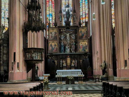 Retablo de la Catedral de San Wenceslao de Olomouc |  La catedral posee tres torres, siendo la sur la más alta, con más de 100 metros de altura, visible desde gran parte de Olomouc y símbolo de la ciudad. En su interior descansan numerosos obispos y arzobispos de la región, entre ellos Francisco de Ditrichstein y Carlos II de Lichtenstein - Kastelkorn, y se encuentra el altar neogótico que custodia reliquias de San Juan Sarkander, mártir canonizado en 1995. Los visitantes pueden apreciar la combinación de elementos románicos, góticos y neogóticos, desde las sólidas columna s y bóvedas hasta los vitrales y detalles ornamentales, que narran la historia de casi nueve siglos de vida religiosa y artística.  Más allá de su función como lugar de culto, la Catedral de San Wenceslao es un testimonio vivo de la historia de Olomouc y de la importancia de Moravia en la vida eclesiástica de la región. Cada torre, cada vitral y cada cripta cuentan historias de fe, poder y tradición que han marcado el carácter de la ciudad. Hoy, tanto peregrinos como turistas recorren sus pasillos, maravillándose con su altura, la luz que atraviesa sus vitrales y la solemnidad de su espacio sagrado. Su torre meridional, con sus 100,65 m, es la torre de iglesia más alta en Moravia (la segunda más alta en la Rep. Checa). La planta de tres naves se deriva de la disposición original medieval.  La construcción fue iniciada por el príncipe Svatopluk en los años 1104 – 1107. Su hijo Václav siguió en su obra y tras la muerte de este continuó el obispo Jindrichu Zdíkovi.