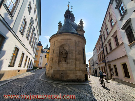 Capilla de San Juan Sarkander de Olomouc |  Seguimos la visita por Chapel of St. Jan Sarkander o Capilla de san Juan GPS N49.5946154 E17.2517821 , casi no la pasamos pero una mujer nos indica que es muy bonita  La Capilla de San Juan Sarkander en Olomouc se levanta en el lugar de la antigua prisión de la ciudad, donde este sacerdote moravo fue encarcelado, torturado y finalmente murió el 17 de marzo de 1620 durante la Guerra de los Treinta Años. Considerado mártir por su fidelidad al secreto de confesión, fue canonizado por el papa Juan Pablo II en 1995, en una misa multitudinaria celebrada precisamente en Olomouc. El edificio actual, de estilo neobarroco, fue diseñado por el arquitecto Eduard Sochor y construido entre 1908 y 1912, sustituyendo a capillas anteriores que ya recordaban la memoria del santo. La capilla es de dos plantas, con una cúpula coronada por linterna, y en el nivel superior se abre un óculo que permite que la luz descienda hasta el sótano. En ese espacio subterráneo se conserva el potro de tortura, reliquia silenciosa de los sufrimientos de Sarkander.  El exterior presenta una escalinata doble, una estatua de San Juan Nepomuceno y una imagen del propio Juan Sarkander en una hornacina. Frente al edificio se encuentra la fuente llamada “Manantial de agua viva de San Juan Sarkander”, inaugurada en 2007, que utiliza agua de un pozo situado en la cripta de la capilla. Hoy en día, este lugar no solo es un monumento religioso y un espacio de culto, sino también un sitio de memoria histórica que atrae tanto a peregrinos como a visitantes interesados en la historia espiritual y cultural de Olomouc.