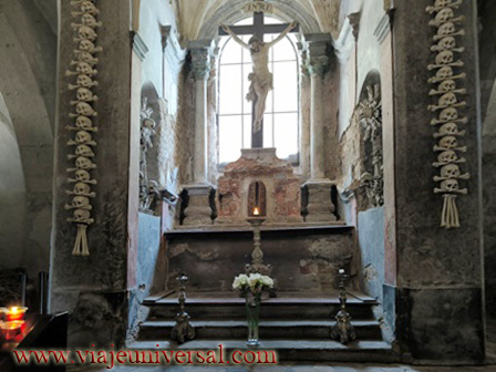 Osario de Sedlec Kutná Hora |  El origen de la capilla se remonta al siglo XIII, cuando el abad del monasterio local introdujo tierra proveniente del Gólgota en Jerusalén, convirtiendo el cementerio en un lugar sagrado y atrayendo peregrinos de toda Europa. A partir del siglo XIV, la peste negra y las guerras husitas provocaron un incremento masivo de cadáveres, lo que llevó a la necesidad de reorganizar y reutilizar los restos humanos. En el siglo XVI, se comenzaron a realizar los primeros arreglos con huesos, aunque fue en 1870 cuando el escultor y monje František Rint, bajo el encargo de la familia Schwarzenberg, transformó la capilla en la obra que hoy conocemos, organizando los huesos de manera artística para crear un espacio de reflexión y memoria.  La capilla conserva su estructura gótica, con bóvedas de crucería que aportan solemnidad al ambiente y permiten que la luz incida sobre los elementos decorativos de manera dramática. Su interior está completamente cubierto por huesos humanos cuidadosamente dispuestos, creando composiciones que combinan arte y simbolismo:  Un gran candelabro central contiene al menos un hueso de cada parte del cuerpo humano, funcionando como símbolo de la universalidad de la muerte.