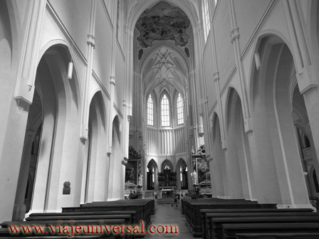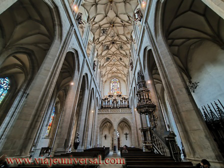 Iglesia de san Vito  de Cesky Krumlov |  Caminamos hasta la iglesia de san Vito GPS N48.8101676 E14.3133637  que se alza sobre otra de las colinas de la ciudad como signo de poder con el poder político del castillo.  La iglesia de San Vito en Ceský Krumlov es uno de los principales ejemplos de arquitectura gótica en el sur de Bohemia y una pieza esencial en el perfil histórico de la ciudad. Su construcción comenzó en 1407 y se completó en 1439, en sustitución de una capilla anterior dedicada también a San Vito. El proyecto fue impulsado y financiado en gran parte por la influyente familia Rosenberg, señores de la región, cuyo escudo aún puede verse en algunos elementos decorativos del templo. El edificio presenta una planta basilical de tres naves separadas por esbeltas columnas y cubiertas con bóvedas de crucería, así como una imponente torre en la fachada occidental que se añadió en fases posteriores.  En el interior se conservan importantes elementos artísticos de distintas épocas, ya que la iglesia fue objeto de remodelaciones y ampliaciones a lo largo de los siglos. Entre ellos destacan frescos góticos originales, retablos renacentistas y barrocos, así como un altar mayor neogótico del siglo XIX que sustituye al original medieval. Varias capillas laterales albergan sepulturas y monumentos funerarios de miembros de familias nobles y clérigos influyentes, lo que refleja su importancia como centro religioso y social.
