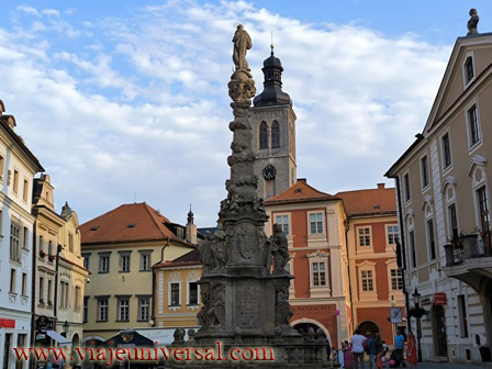 Plaza Mayor de Cesky Krumlov |  Solamente nos queda visitar la plaza Mayor GPS N48.8104687 E14.3149499 , conocida como Námestí Svornosti (Plaza de la Concordia), es el corazón del casco histórico y el principal espacio público de la ciudad. Está rodeada por elegantes casas burguesas de los siglos XVI y XVII, muchas de ellas con fachadas renacentistas y barrocas ricamente decoradas. Durante siglos fue el centro de la vida comercial y social, albergando mercados, ferias y actos cívicos. Hoy, además de ser un punto de encuentro para vecinos y turistas, es escenario de festivales, conciertos y celebraciones tradicionales, especialmente durante el verano y en Navidad. En uno de sus costados se encuentra el antiguo Ayuntamiento, formado por la unión de varias casas medievales, con su característica fachada renacentista y arcadas.  En el centro de la plaza se levanta la Columna de la Peste GPS N48.810512 E14.3148373, también conocida como Columna Mariana, erigida en 1716 como exvoto de agradecimiento por la protección de la ciudad frente a las epidemias de peste que asolaron la región en el siglo XVII. Es una obra barroca ricamente ornamentada, coronada por la imagen de la Virgen María y rodeada de esculturas de santos protectores, como san Wenceslao, san Roque, san Sebastián y san Francisco Javier, todos ellos asociados a la intercesión contra las enfermedades. La columna no solo tiene un significado religioso, sino que también simboliza la resiliencia y la fe de los habitantes de Ceský Krumlov frente a las adversidades históricas.