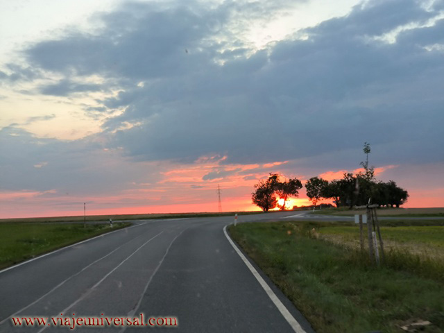 Anochece camino de Kutná Hora a Sazava  |  Continuamos el viaje unos 39 km más hasta nuestro siguiente destino en Sazava donde pasaremos la noche.  El parking que utilizamos para autocaravanas en la ciudad de Sazava GPS N49.877518 E14.906387, es gratuito y no tiene ninguna restricción.  Día 17 de Agosto  (sábado) Ruta: Sazava-Konopiste