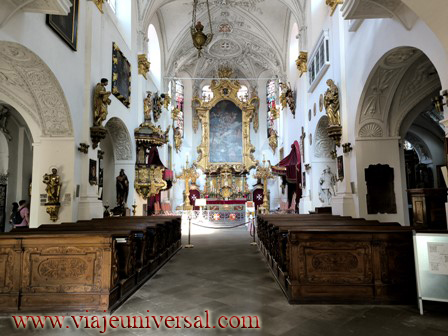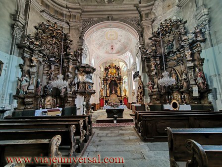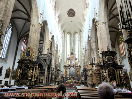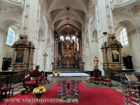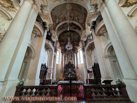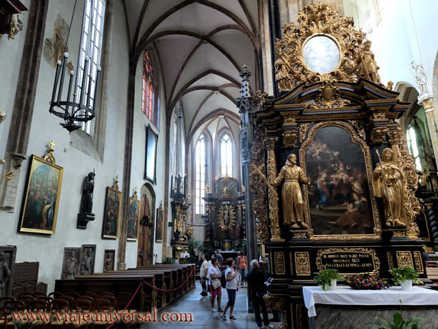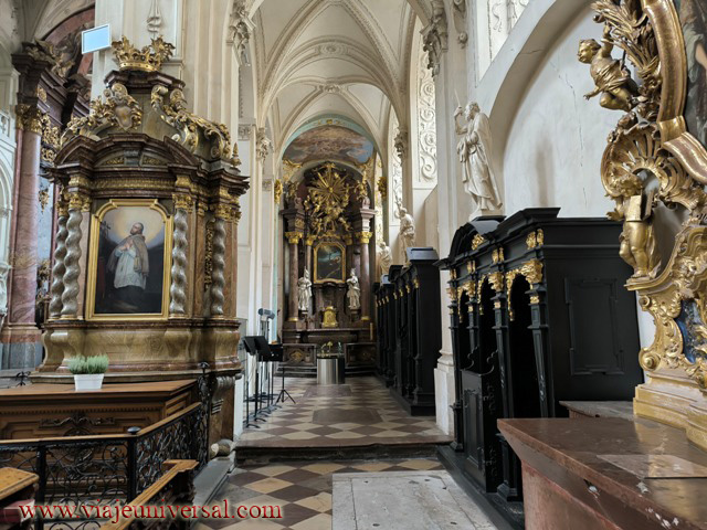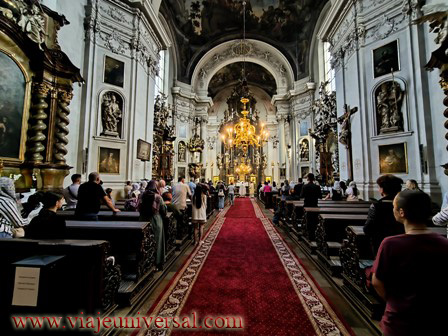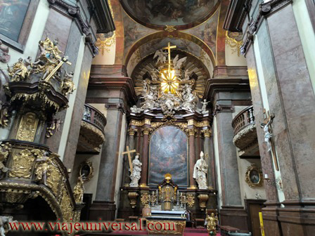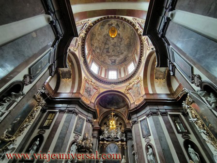 El interior sorprende por la amplitud del espacio central bajo la cúpula, que está decorada con frescos y relieves de gran calidad artística. Entre los tesoros más notables se encuentra el órgano barroco, construido en 1702, considerado uno de los instrumentos más valiosos de la ciudad. La tradición afirma que Wolfgang Amadeus Mozart tocó este órgano durante su estancia en Praga, lo que añade un atractivo especial al templo. A día de hoy, sigue utilizándose en celebraciones litúrgicas y en conciertos, convirtiendo la iglesia en un espacio de encuentro entre arte, música y espiritualidad.
