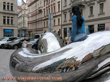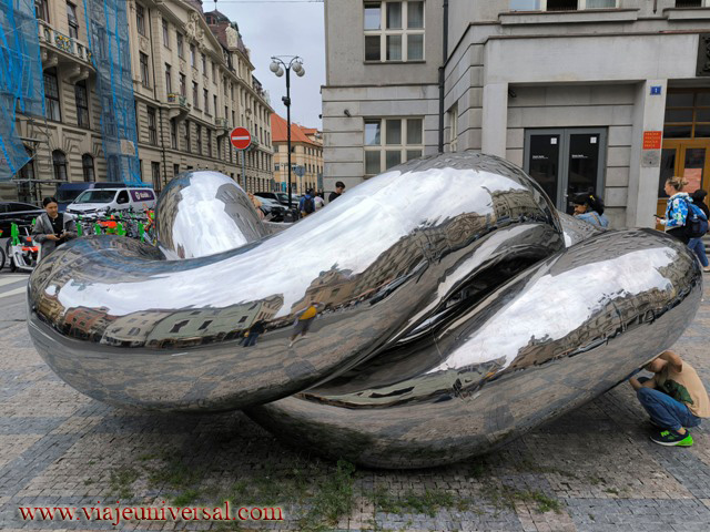 En la plaza podemos ver una escultura titulada Trichodon, del artista checo Lukáš Rais, fue una de sus obras más ambiciosas y se instaló temporalmente en la plaza Franz Kafka, junto a la Ciudad Vieja de Praga, en el marco del festival Sculpture Line. Está realizada en acero inoxidable a partir de tuberías industriales normadas, un material que Rais acostumbra a emplear en sus esculturas para transformarlo mediante curvaturas y entrelazados en formas poéticas y fluidas. Aunque su origen es claramente técnico y utilitario, la obra adquiere un carácter orgánico, casi vivo, que se integra y dialoga con el entorno urbano. La superficie pulida del acero refleja el cielo, la luz y las siluetas de los transeúntes, de modo que la escultura no es un objeto aislado, sino un elemento en constante interacción con lo que la rodea. Esa capacidad de multiplicar imágenes y deformarlas hace que Trichodon se perciba de manera distinta a cada instante, según la posición del espectador y la intensidad de la luz. La pieza estuvo expuesta hasta 2024 y, aunque actualmente se encuentra desinstalada, permanece en la memoria como un ejemplo del modo en que la escultura contemporánea puede transformar un espacio histórico de la ciudad y establecer un diálogo entre lo industrial, lo artístico y lo simbólico.