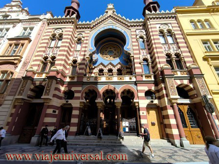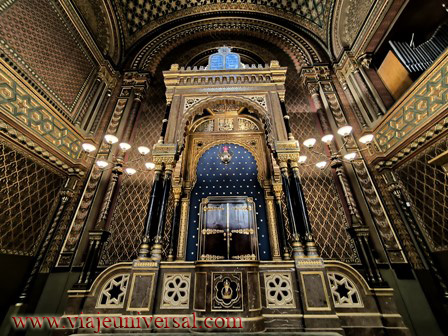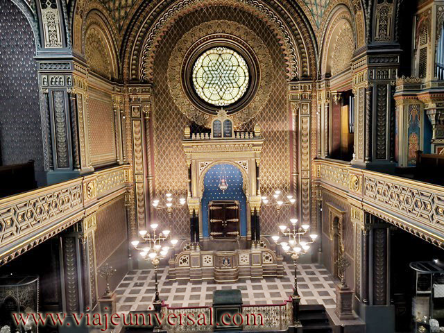 La Sinagoga Española (Španelská synagoga) es la más joven y, al mismo tiempo, una de las más espectaculares del barrio judío de Praga. Fue construida en 1868 en el mismo lugar donde antes se encontraba la antigua Sinagoga Vieja de los Judíos Alemanes. Su nombre se debe al estilo arquitectónico que la caracteriza: un fastuoso neo-morisco inspirado en las sinagogas sefardíes de la España medieval, con arabescos dorados, arcos de herradura y ricos mosaicos geométricos que recuerdan a la Alhambra de Granada.