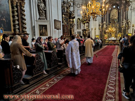 El interior sorprende por su riqueza ornamental, con altares barrocos, esculturas y frescos que reflejan el espíritu de la Contrarreforma. Entre los elementos más destacados se encuentran el altar mayor, presidido por una monumental representación de Cristo Salvador, y las capillas laterales, que conservan retablos y obras de gran valor artístico. Además de ser un espacio de culto, el templo ha tenido siempre un vínculo estrecho con la Universidad Carolina: desde el siglo XVII ha sido considerado su templo universitario, y hasta la actualidad acoge ceremonias académicas y misas destinadas a estudiantes, profesores y fieles.