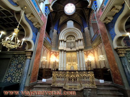 El Aron HaKodesh (Arca Sagrada), donde se guardan los rollos de la Torá, se encuentra enmarcado por un gran arco de herradura ricamente decorado. La galería de mujeres, situada en el piso superior, está sostenida por columnas finamente ornamentadas, y desde allí se obtiene una vista espectacular del conjunto.