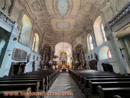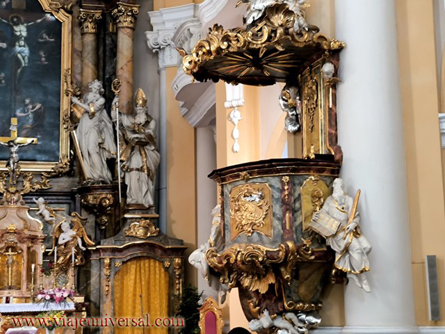 Los frescos de Peter Adam aportan escenas bíblicas y alegorías de las virtudes cristianas, pintadas en tonos claros que refuerzan la sensación de amplitud. A esto se suman las esculturas barrocas de santos y querubines, talladas en madera policromada, que dan vida al altar mayor y al presbiterio.