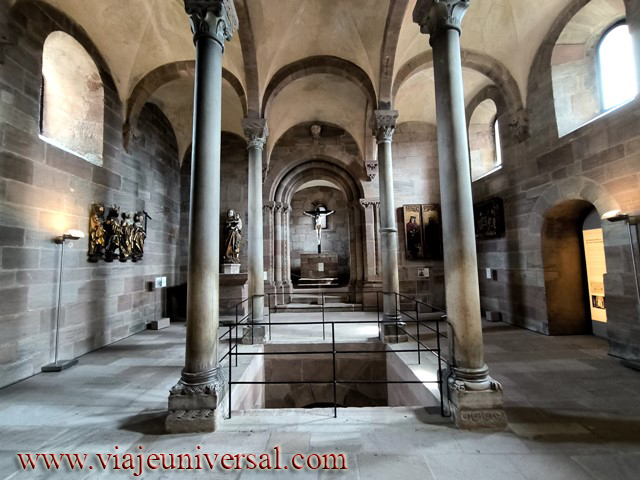 La iluminación de la cripta es tenue, proveniente en parte de pequeñas ventanas y de la luz artificial moderna que permite apreciar los detalles de las columnas y los arcos sin romper la atmósfera de recogimiento. Las paredes son de piedra vista, algunas decoradas con relieves sencillos o inscripciones que recuerdan la antigüedad de la estructura y la continuidad del culto.
