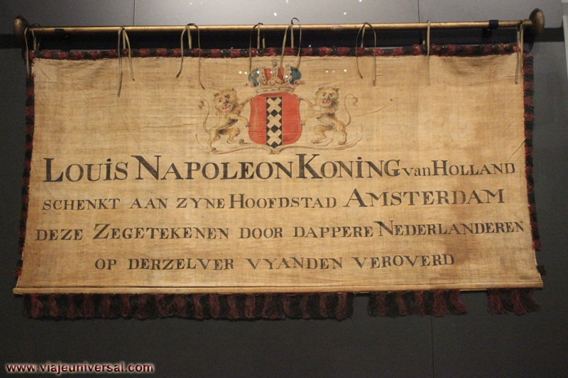Luis Napoleón hizo de Ámsterdam la capital de su reino y ensambla los tesoros nacionales. El 31 de julio 1806 tenía trofeos importantes, incluyendo las banderas capturadas, que se transportan a Ámsterdam desde el Binnenhof (sede del Parlamento holandés) en La Haya. El convoy estaba encabezado por esta bandera, cuyo texto se traduce como: “Luis Napoleón, rey de Holanda, presenta a su capital Ámsterdam estos trofeos incautados por valientes neerlandeses de sus enemigos”.
