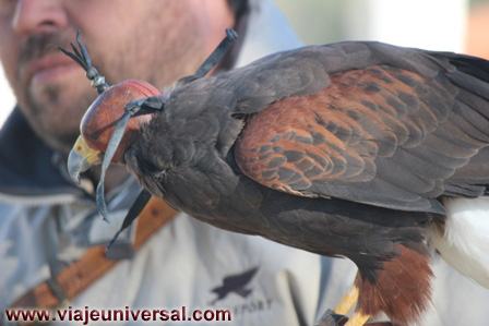Una de la exhibiciones un estupendo ejemplar de halcón o aguililla de harris, demuestra sus potentes vuelos, una característica de su técnica de caza. Abandonado el guante de cetrero y emprendiendo el vuelo en absoluta libertad, el halcón vuela sobre el terreno en los círculos y sigue de cerca los movimientos de los cetreros, esperando la recompensa de la caza.
