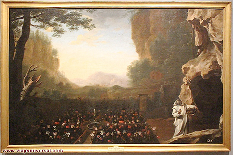 La escena del cuadro se ve a la izquierda en el primer plano un monje, pudiera tratarse de San Bruno en su retiro al macizo montañoso de La Chartreuse , donde en 1084 fundo la orden de la Cartuja. El cartujo esta situado a la entrada de una cueva donde en su interior se ve el retablo dedicado a la Virgen y tanto la fuente como las flores representadas –tulipanes, lirios, azucenas y girasoles– son símbolos marianos.