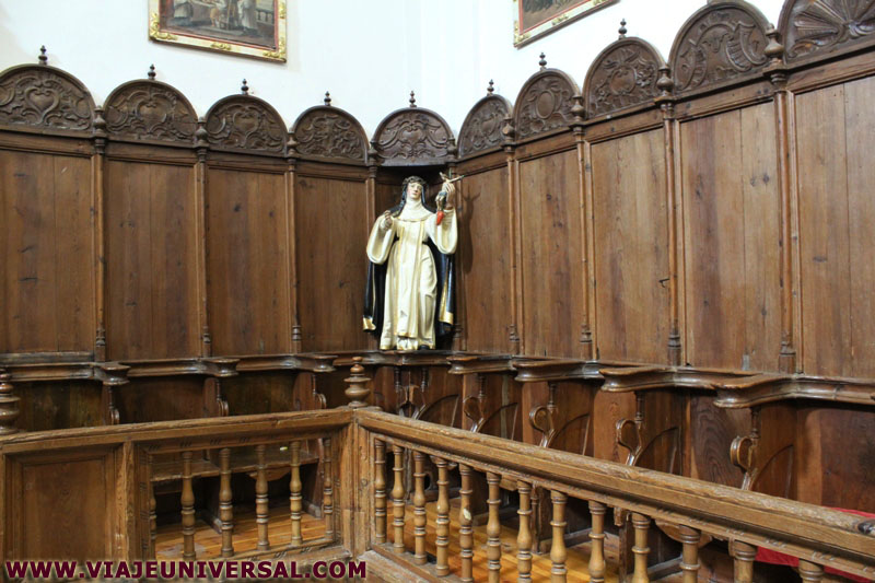 Enfrentado esta la sillería del coro construida en madera de pino; tiene formas sencillas de aspecto rural, carece de decoraciones en sus asientos. Sobre la crestería dispuesta posteriormente, tiene cuarenta asientos decorados con dibujos geométricos, lazos y decoración a servilleta. En las dos esquinas hay una pequeña hornacina con esculturas de monjas de la congregación que sujetan en sus manos la figura de cristo.