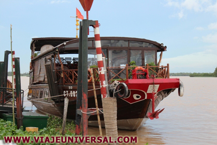 A las 7,15 h., más o menos, aparece Nga con un barco más pequeño (el Lady Hau no puede maniobrar entre los de mercancías del mercado, siempre hay que abandonarlo y pasar a otro más pequeño, desembarcar o volver al hotel en él). Como ven que nos aprestamos a cambiar de barco nos dicen que no hay prisa, que disfrutemos del desayuno, que nuestra guía esperará. Bueno, para degustar un poquito más siempre hay hueco. Cuando creemos que podemos dar por finalizado el desayuno, cinco o diez minutos más tarde –no sin que antes Nga eche una bronca de padre y muy señor mío a la camarera, por no decirnos que uno de los ingredientes que se ha echado Richi en el pho es de la familia del cilantro ¡Qué carácter! Ya le habíamos dicho a Nga que eviten echar cilantro a las comidas y ésta lo ha transmitido a Viet-Y Co. para que se lo pase a todos y cada uno de los lugares donde tenemos concertadas comidas o cenas. Y así será durante todo el viaje–.