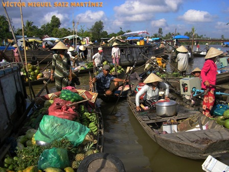 A las 5 nos despiertan, para poco después bajar las escaleras y encontrarnos que lo que era un restaurante y la recepción del hotel, se ha convertido en un garaje-dormitorio, con varias motos aparcadas y dos personas durmiendo. Una de ellas se despierta y nos abre la puerta, donde ya se encuentra el barquero con nuestro desayuno, consistente en pan y plátanos. Nos dirigimos a la orilla del río, dónde subimos en una pequeña embarcación a motor, y comenzamos a navegar en el momento en que empieza a clarear, asistiendo a un amanecer impresionante, con el sol anaranjado elevándose por encima de las palmeras. Sin apenas darnos cuenta, llegamos al primer mercado flotante donde las embarcaciones –que llevan pintadas en su casco una especie de ojos, para ahuyentar a los malos espíritus que habitan en las aguas-, se arremolinan en una sinfonía de colores realmente atractiva. El tamaño de la barca, hace que nos podamos introducir en el interior del mismo y nos damos cuenta que, al igual que en los mercados “no flotantes” a los que estamos acostumbrados, se puede comprar de todo: fruta, verdura, carne, hielo, recipientes de todo tipo, comida, bebida, etc., etc. Observamos in situ las transacciones que los vietnamitas hacen desde sus vistosas embarcaciones y nos resulta muy auténtico, puesto que no hay “guiris”, disfrutando de algo que jamás hasta ahora habíamos visto. Después nos internamos por pequeños canales, donde la quietud del agua, la exuberante vegetación y un silencio casi monacal (es curioso, pero apenas hay pájaros en los alrededores), sólo interrumpido por el ruido quejumbroso del motor, nos hace recordar todas las películas que hemos visto de la guerra del Vietnam, en especial Apocalipsys Now y hay momentos en que parecen que van a surgir “Charlies” de la jungla. Una hora después llegamos a otro mercado y al igual que el anterior contemplamos alucinados todo lo que ocurre a nuestro alrededor. Son las 9 de la mañana e iniciamos el regreso percatándonos de que la vida fluye en el río: la gente se asea en el mismo, limpia la comida, extrae pescado, transporta mercancías, repara sus embarcaciones....una vida que estamos profanando con nuestras fotografías.