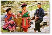 Trajes: Los H'Mong hace sus propias ropas de lino. El traje de las mujeres consiste en una falda, una blusa que se abre en el frente y tiene un bordado en la parte posterior, un delantal para cubrir la falda en el frente, y polainas.